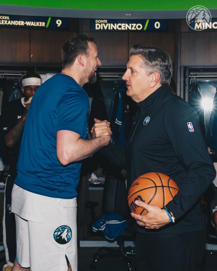 森林狼更衣室祝贺芬奇200胜:拿到比赛用球 华子戈贝尔裹浴巾合影