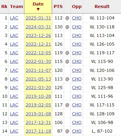 此役获胜后,快船对黄蜂已取得14连胜,上次输球还是在2017年。