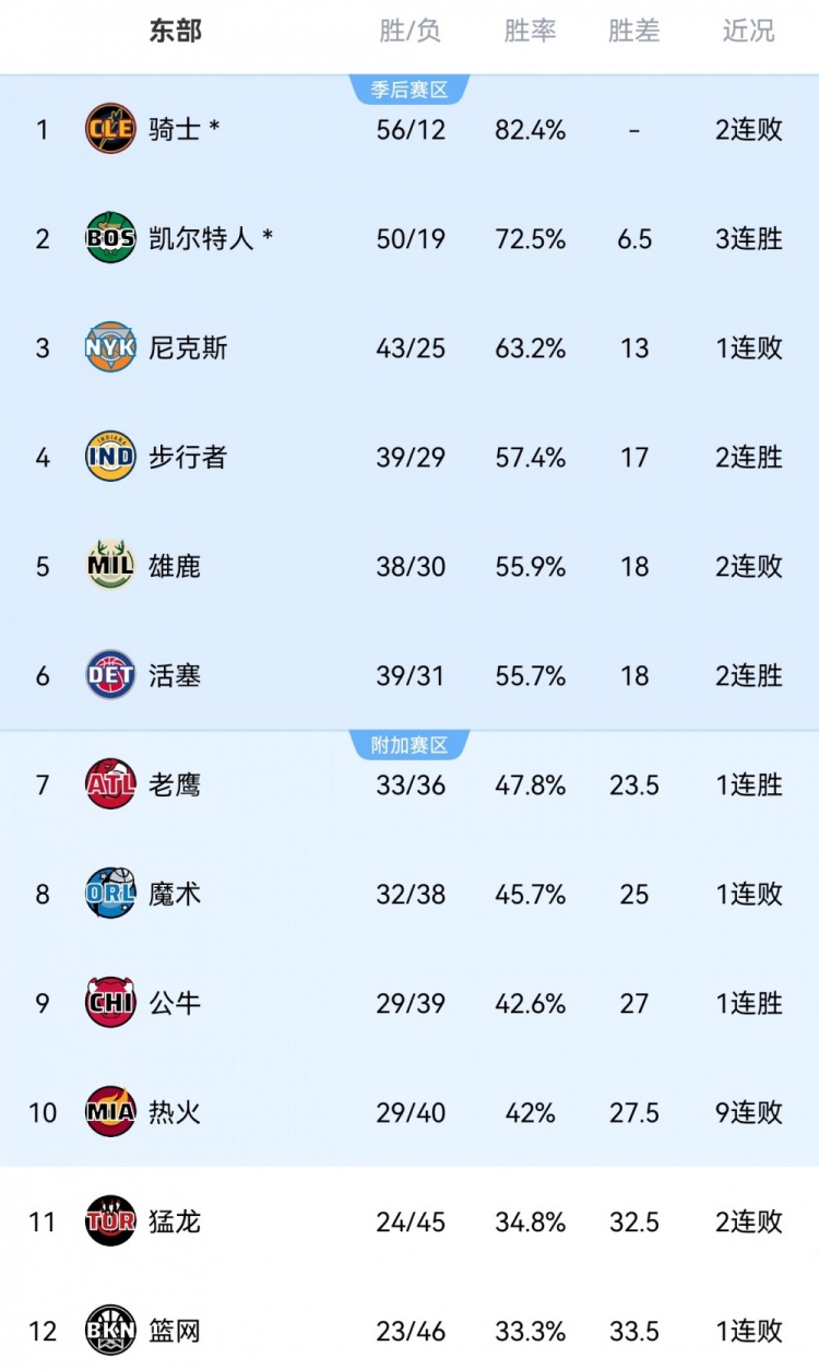 至此,热火遭遇了9连败。而他们排名仍在东部附加赛区,仍领先第11的猛龙5个胜场。