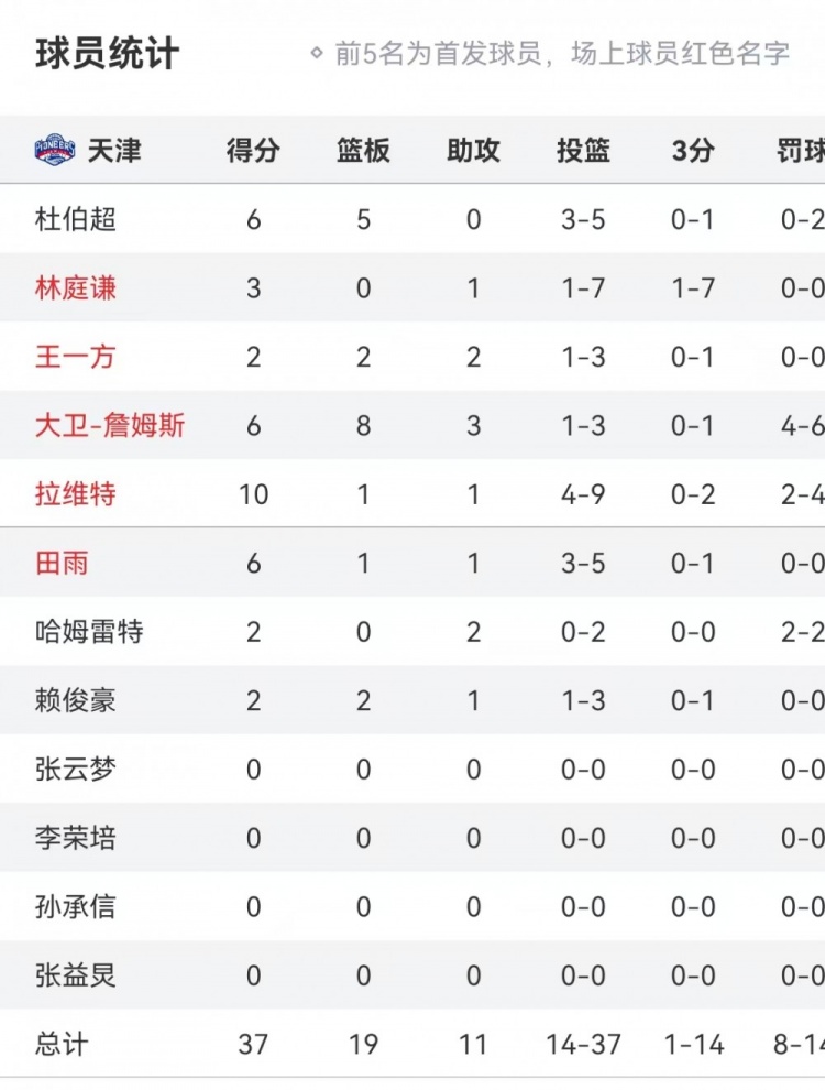 天津全队上半场在三分线外的手感都不理想,全队出手14次三分仅投中1球,其中林庭谦一人三分7投1中。