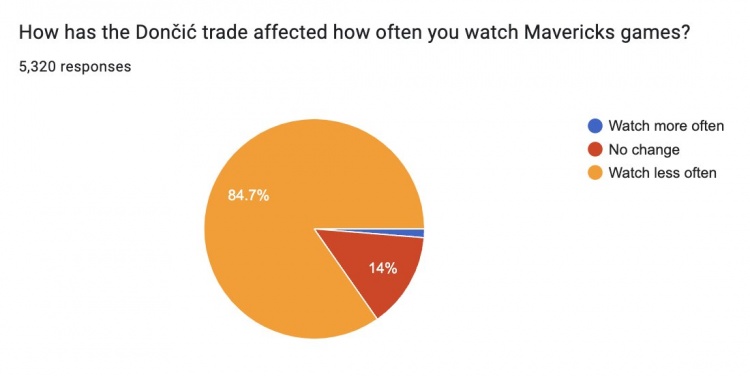 在东契奇交易如何影响你看独行侠比赛这个问题上,84.7%的球迷表示已经较少看独行侠的比赛,14%的球迷表示没有变化,只有1.3%的球迷表示自己看的更多了。