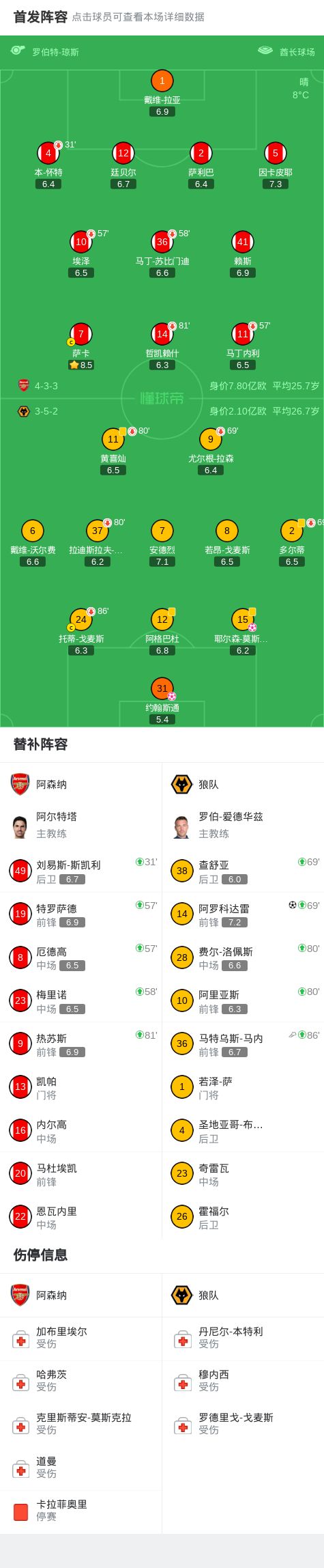 - 2-1险胜,阿森纳英超对阵狼队已取得9连胜