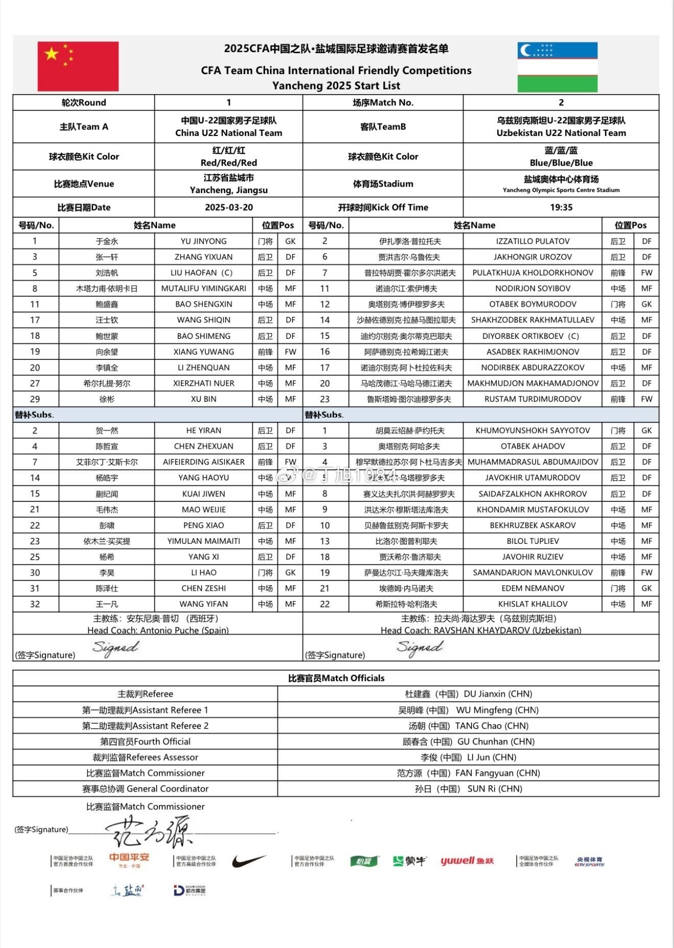 03月20日讯 2025CFA中国之队·盐城国际足球邀请赛,中国男足U22vs乌兹别克斯坦U22,赛前双方首发公布!此前从国家队集训回归的徐彬、汪士钦、刘浩帆先发出战。