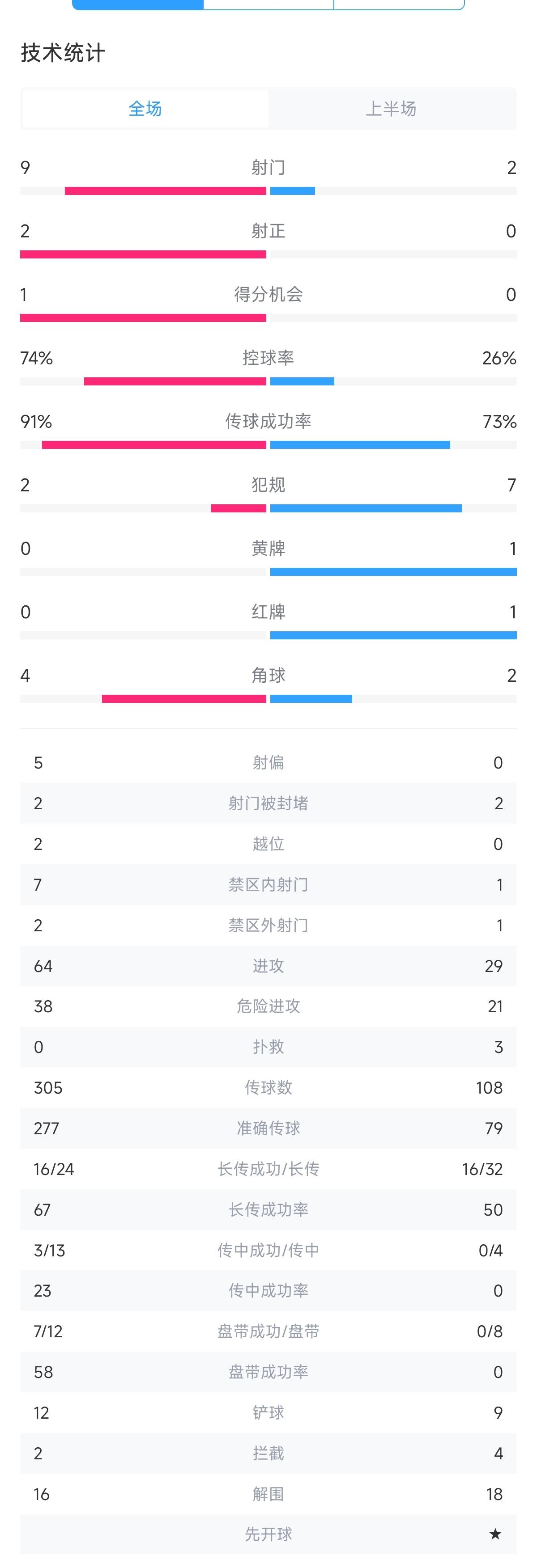 国足vs沙特半场数据:国足0射正+染红 沙特9射门+进球被吹+中横梁