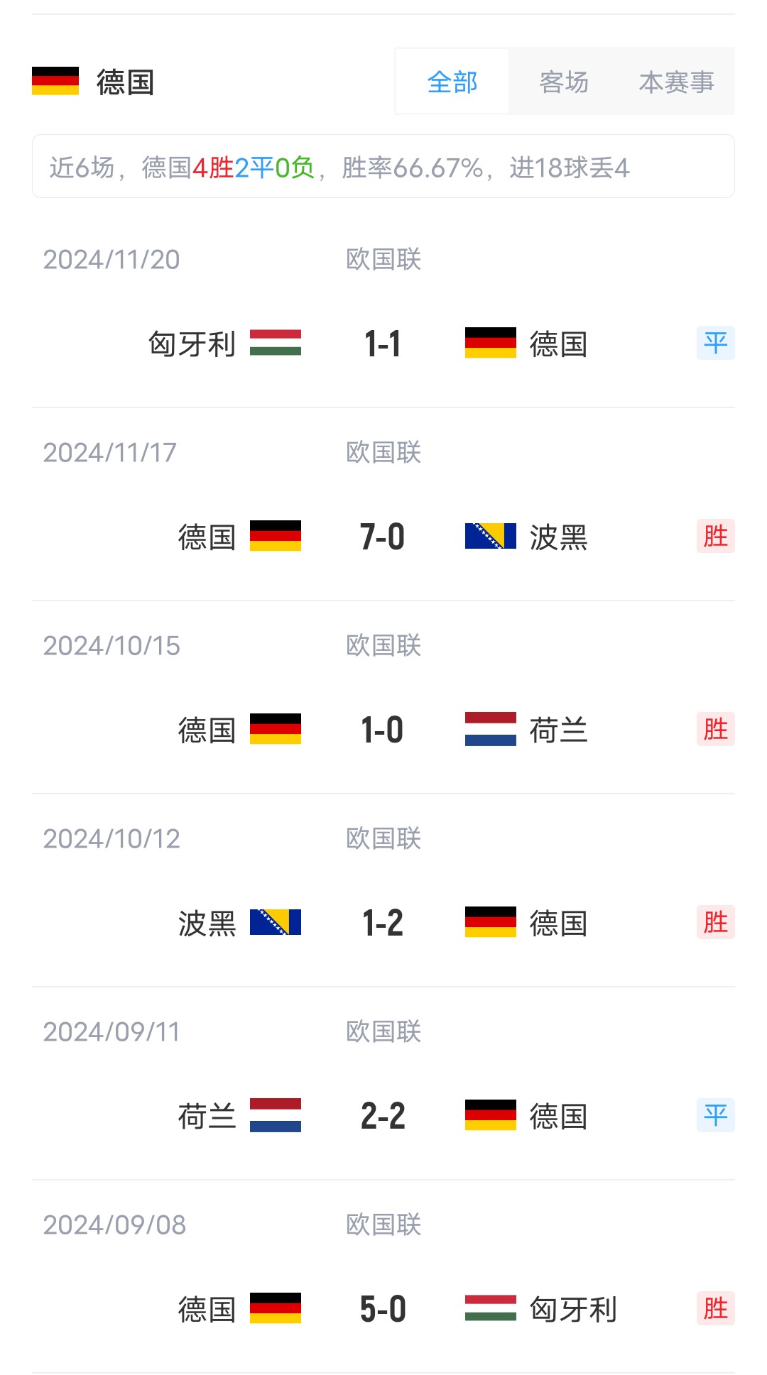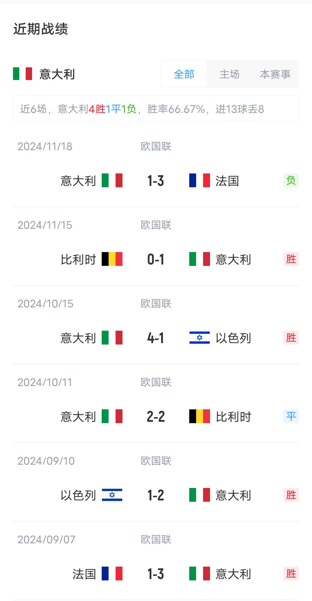 在欧国联小组赛中,意大利排名B组第2,德国排名C组第1;双方近6场直接对话中,意大利取得了1胜4平1负的战绩。两队最近一次交手,是在2016年11月16日,友谊赛意大利0-0战平德国。