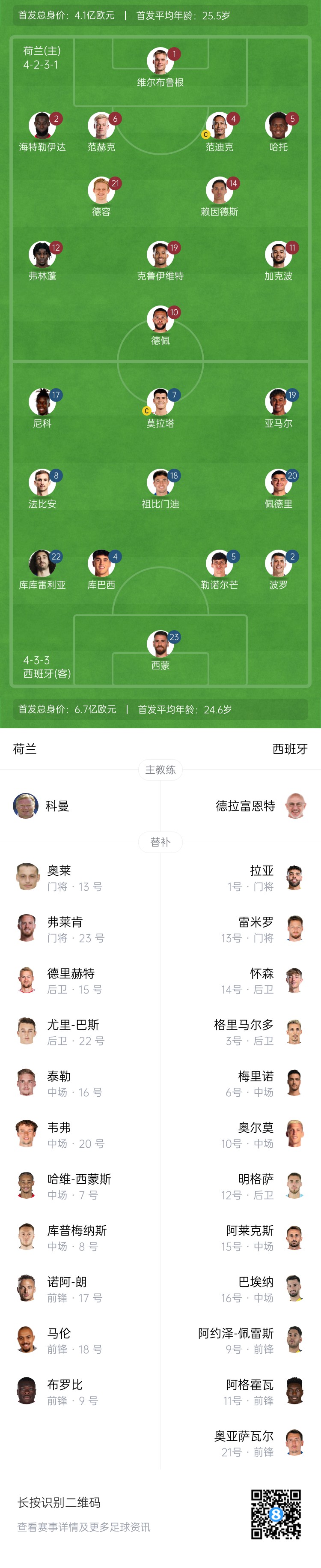 3月21日讯 北京时间03:45,欧国联1/4赛决赛首回合,荷兰主场迎战西班牙。赛前官方公布了双方的首发名单。