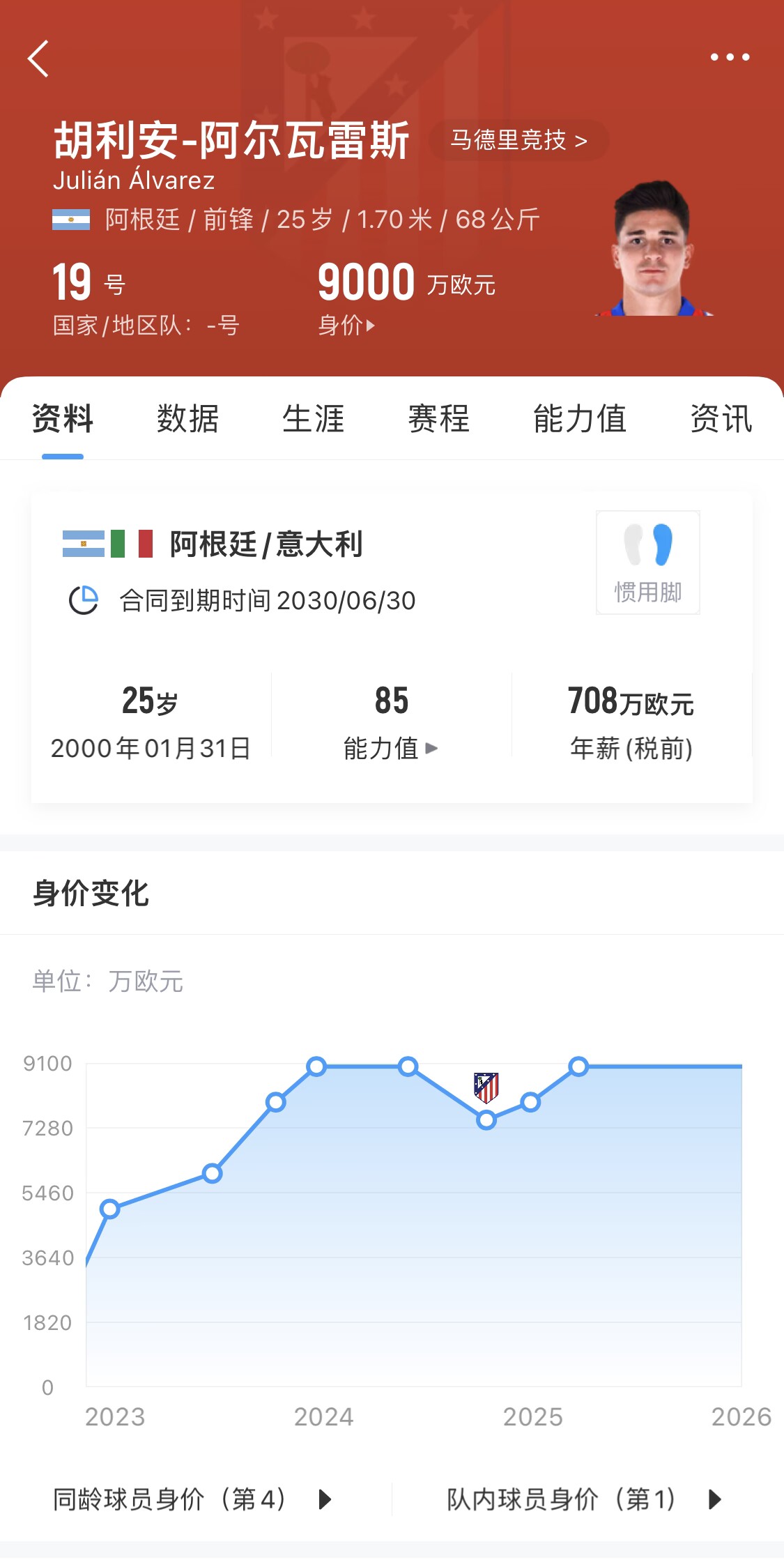 03月22日讯 昨日德转更新西甲球员身价,阿尔瓦雷斯的身价重新回到9000万欧,但没有破亿。
